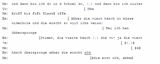 Mm: und dann bin ich doch in die Schule gekommen /Yw: Mhm /Mm: und dann bin ich weiter rauf bis fünfte Klasse herauf / Em: Aber die vierte hast du noch wiederholen müssen und die erste, soweit ich’s weiß. / Mm: Nein ich habe übersprungen / Em: Stimmt, die vierte hast Du die vi- ja die viert hast Du übersprungen aber die erste nicht / Mm: die erste nicht, eben.