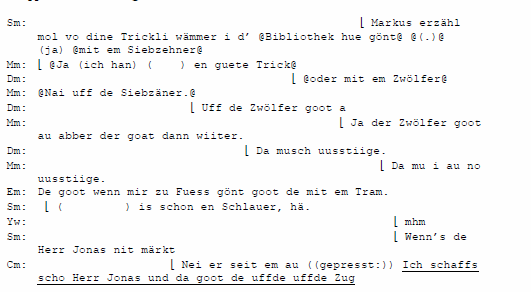 Zur Erleichterung des Verständnisses der Dialektwendung des Schweizerdeutschen erfolgt jeweils nach den Transkriptauszügen eine Übersetzung der wörtlichen Rede ins Hochdeutsche unter Auslassung von Pausen, Lachen etc., gleichzeitige Äußerungen werden entsprechend der Abfolge ihres Auftretens nacheinander dargestellt: